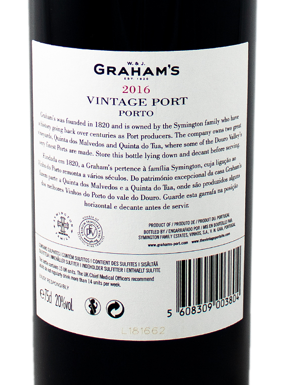 Classic expression of the Graham’s style: concentratedand opulent with layers of fresh, ripe, black fruit flavours.Aromas of mint and eucalyptus with chocolate notes.The Graham 2016 combines superb complexity,structure and balance